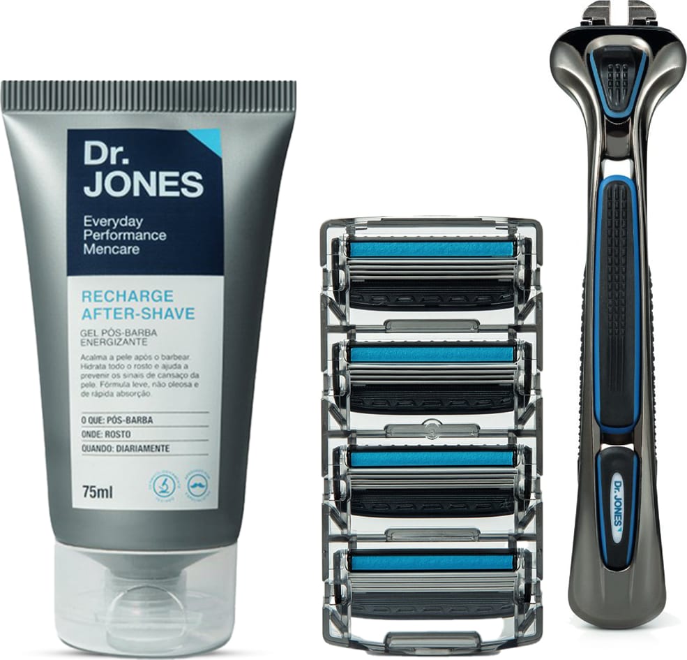 O Combo Dr. Jones traz a tríade essencial para o cuidado do barbear e pós-barba: o Cabo The Razor, o Kit Recargas The Razor 4 (4 unidades) e o Gel Pós-Barba Recharge After-Shave 75ml. Juntos, garantem um barbear seguro e um tratamento pós-barba que refresca, hidrata e trata a pele do homem. Quer evitar a irritação após a raspagem? O gel pós-barba tem Pantenol e Bioativo do Himalaia para acalmar e cicatrizar pequenas lesões.
