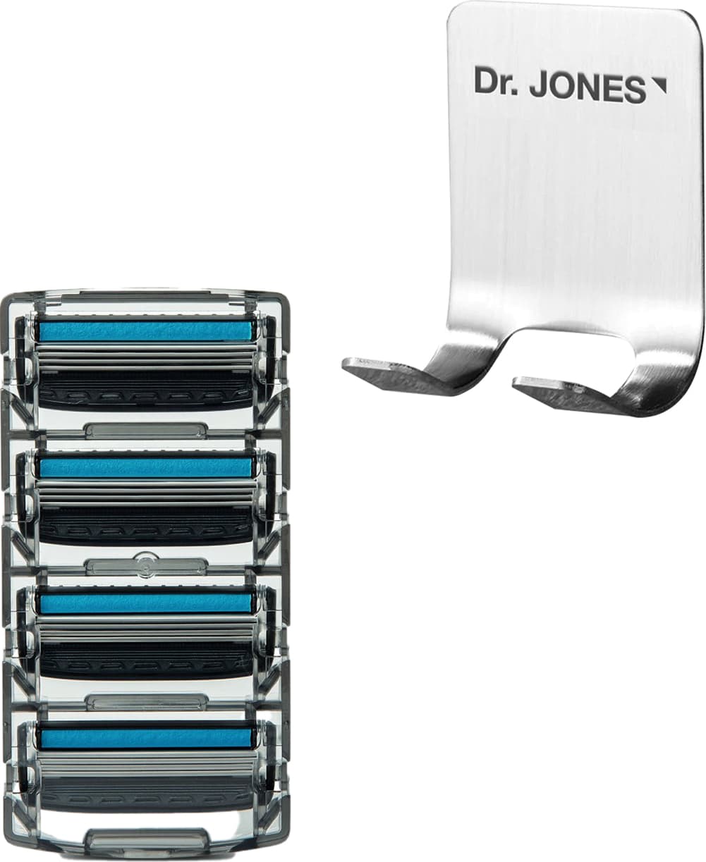 Suporte para parede. Dr. Jones The Razor fixa-se à parede e provê um lugar seguro e bonito, ideal para guardar o seu barbeador. O Suporte The Razor além da praticidade, ajuda a evitar que as lâminas fiquem em contato com a água ou ambientes úmidos, o que aumenta a vida útil do aparelho de barbear.