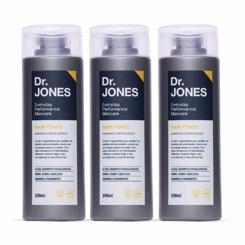 A ciência a seu favor com Hair Force*, o shampoo fortalecedor da Dr. JONES. Este combo traz o poder do Hair Force em triplo para um tratamento completo contra a queda de cabelo.
