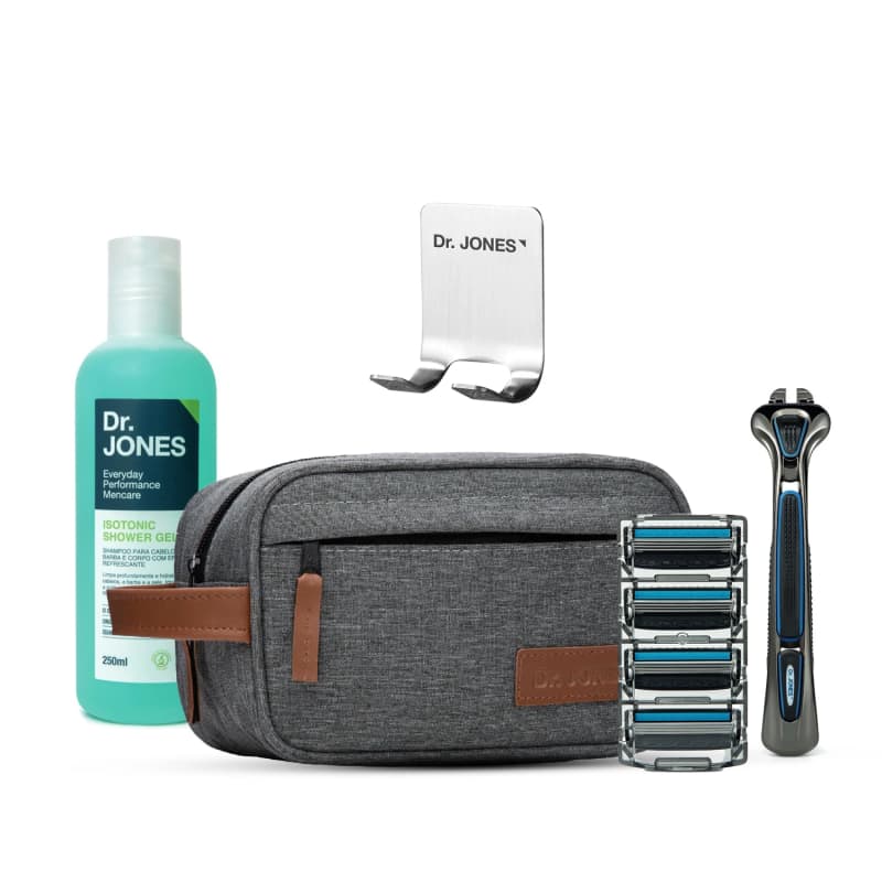 O Kit The Razor 4 Rotina + Suporte é ideal para a rotina de cuidado e higiene do homem. Este combo de 5 itens inclui o Shampoo Barba Cabelo e Corpo Isotonic Shower Gel, o Cabo The Razor, o Kit Recargas The Razor 4, Nécessaire Grafite com Zíper e o Suporte de Parede The Razor. Praticidade de um shampoo multifuncional que repõe sais minerais e garantia de um barbear rente e seguro, com o bônus da organização proporcionada pela Nécessaire e o Suporte de Parede.