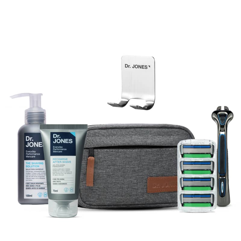 Este combo oferece uma experiência completa de barbear: aparelho The Razor, refis, suporte, nécessaire, balm para barbear Shaving Solution e pós-barba Recharge After-Shave. Tudo para um barbear impecável, pele protegida e hidratada e máxima organização.
